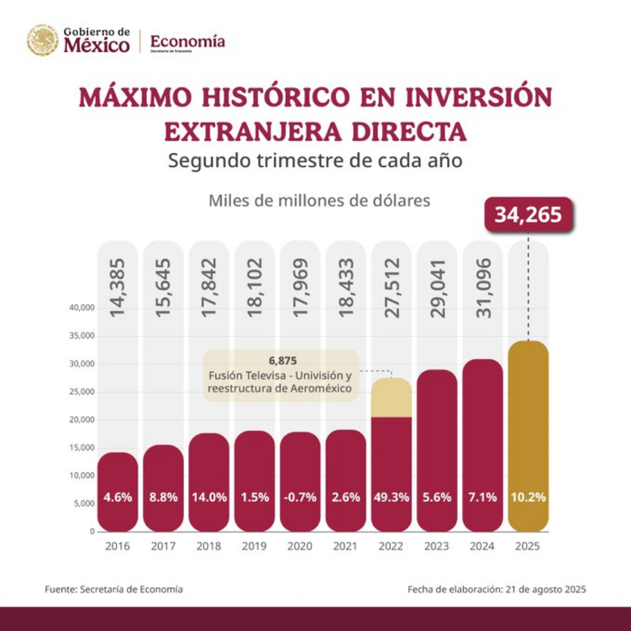 💰📈 #México alcanza récord de inversión extranjera directa en un segundo trimestre: 34,265 mdd, un 10.2% más que en 2024, informó la presidenta @Claudiashein 🇲🇽✨