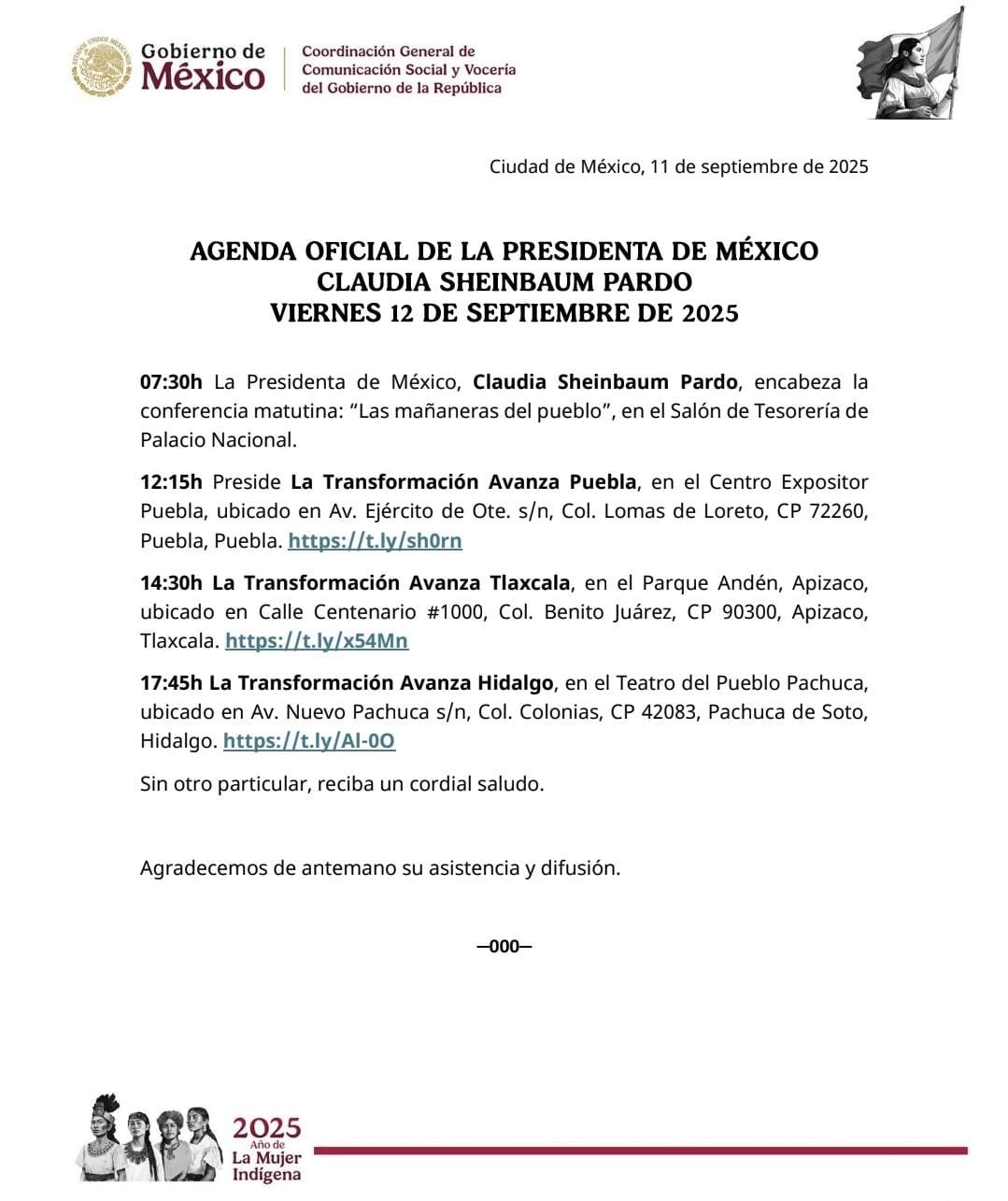 En el marco de su primer informe de Gobierno y tras reunirse con 150 mil personas el fin de semana pasado, la Presidenta Claudia Sheinbaum continuará este viernes 12 de septiembre, con su gira de rendición de cuentas al pueblo de México en los estados de Puebla, Tlaxcala e Hidalgo.