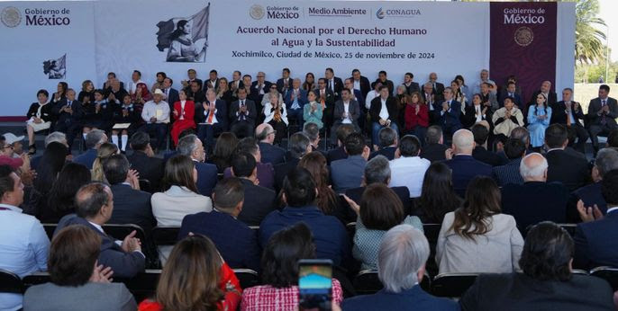 Detalló que, este gran acuerdo, —que forma parte del Plan Nacional Hídrico 2024-2030, presentado el pasado 21 de noviembre—, se contempla poner orden a las concesiones de agua potable; eficientar el uso del agua en el riego con la tecnificación del campo; la colaboración de empresarias y empresarios para cumplir con las normas de tratamiento de agua; así como la elaboración de un Plan Maestro por cada estado de la República y de un Plan de Obras Estratégicas en coordinación con los gobiernos estatales que permitan atender las zonas con mayor estrés hídrico, así como el saneamiento de los ríos Lerma-Santiago, Tula y Atoyac.