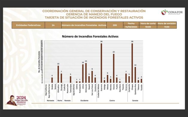Hay activos 205 incendios forestales en 24 estados del país, reportó este martes 14 de mayo la Comisión Nacional Forestal (Conafor).