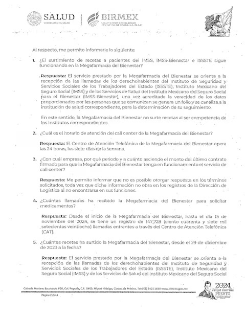 La Megafarmacia del Bienestar no surte recetas al ser competencia de los institutos correspondientes, respondió Birmex a una solicitud de información del 20 de noviembre de 2024.