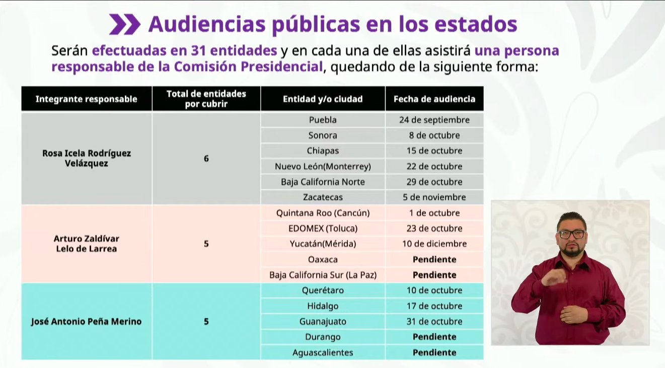 “Las audiencias en todas las entidades, ya están programadas, algunas faltan. Miembros de la comisión van a estar realizando audiencias. Vamos a continuar los martes, miércoles y jueves. Foros abiertos en salón Revolución de la Secretaría de Gobernación. En agosto se revisó, en septiembre son las audiencias públicas, las encuestas de opinión en octubre”, apuntó.