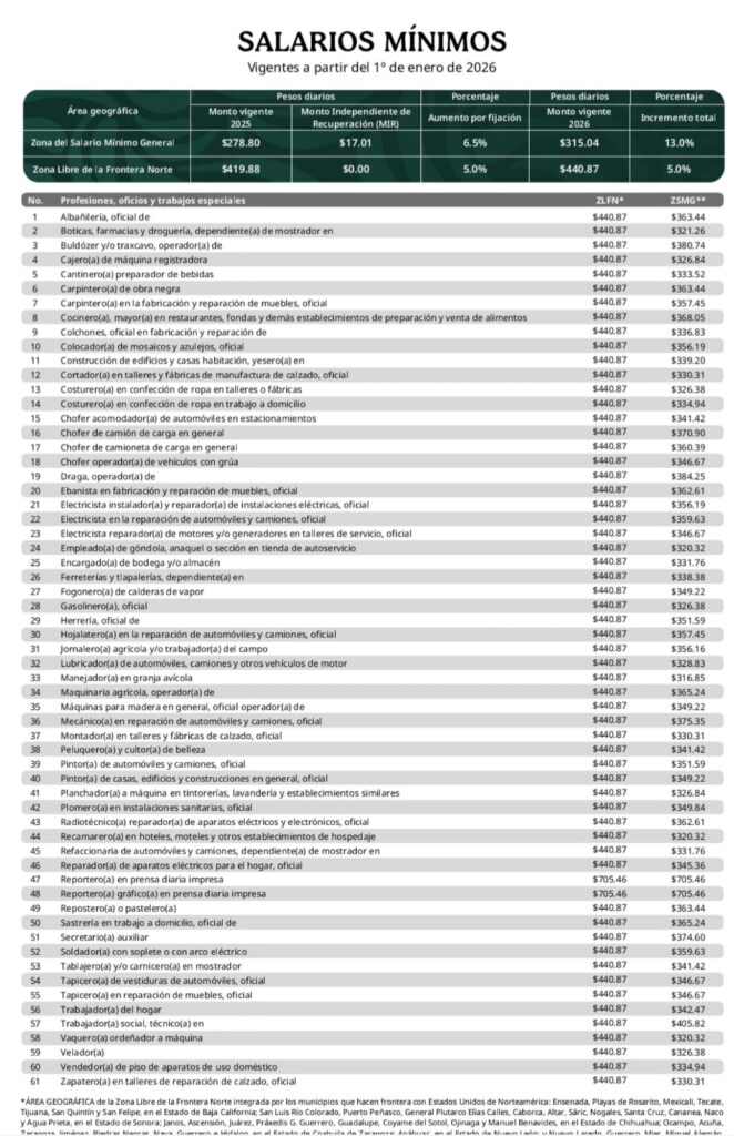 La tabla de salarios mínimos del Gobierno de México para este 2026 incluye 61 oficios, profesiones, o trabajos especiales, entre ellos, destacan el las trabajadoras del hogar, así como albañilería, secretario auxiliar, radio técnico, soldador o tablajero, incluso el oficio de reportero (a) en medios impresos.