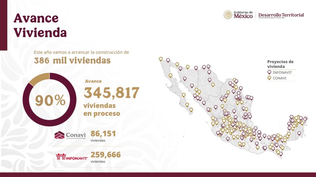 El Gobierno de México, a través de la Secretaría de Desarrollo Agrario, Territorial y Urbano (Sedatu), informó que como parte del programa Vivienda para el Bienestar entre noviembre y diciembre de este año se entregarán 6 mil 401 viviendas terminadas: 4 mil 871 del Instituto del Fondo Nacional de la Vivienda para los Trabajadores (Infonavit) y mil 530 de la Comisión Nacional de Vivienda (Conavi).