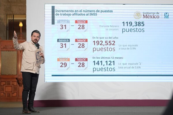 En febrero 2025 se crearon 119 mil 385 nuevos puestos y en lo que va del año se han cerrado 192 mil 552 nuevos empleos, una tasa del 0.9 por ciento de crecimiento, de los cuales 54.2 por ciento son permanentes; mientras que de febrero del 2024 a febrero 2025 son 141 mil 121 empleos.