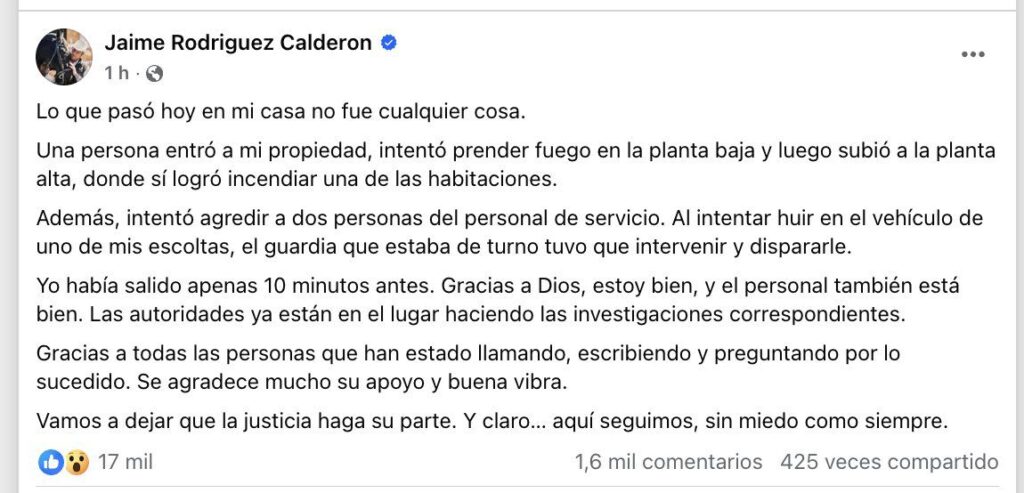 Las autoridades ya están en la casa de Rodríguez Calderón, y se espera que en las próximas horas se den a conocer las causas del ataque.