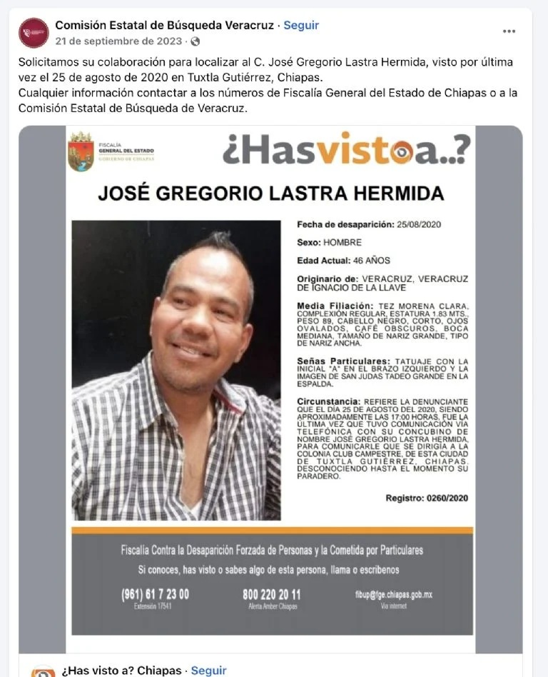 José Gregorio Lastra Hermidia fue reportado como desaparecido hace cinco años. Desde entonces, una ficha de búsqueda ha estado vigente en los estados de Chiapas y Veracruz.
