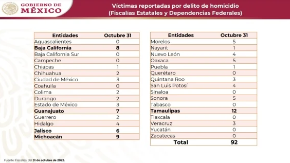 Solo ayer lunes 31 de octubre, en el país se contabilizaron 92 asesinatos, 12 de ellos en Tamaulipas; hasta ahora, mayo había sido el mes con más asesinatos
