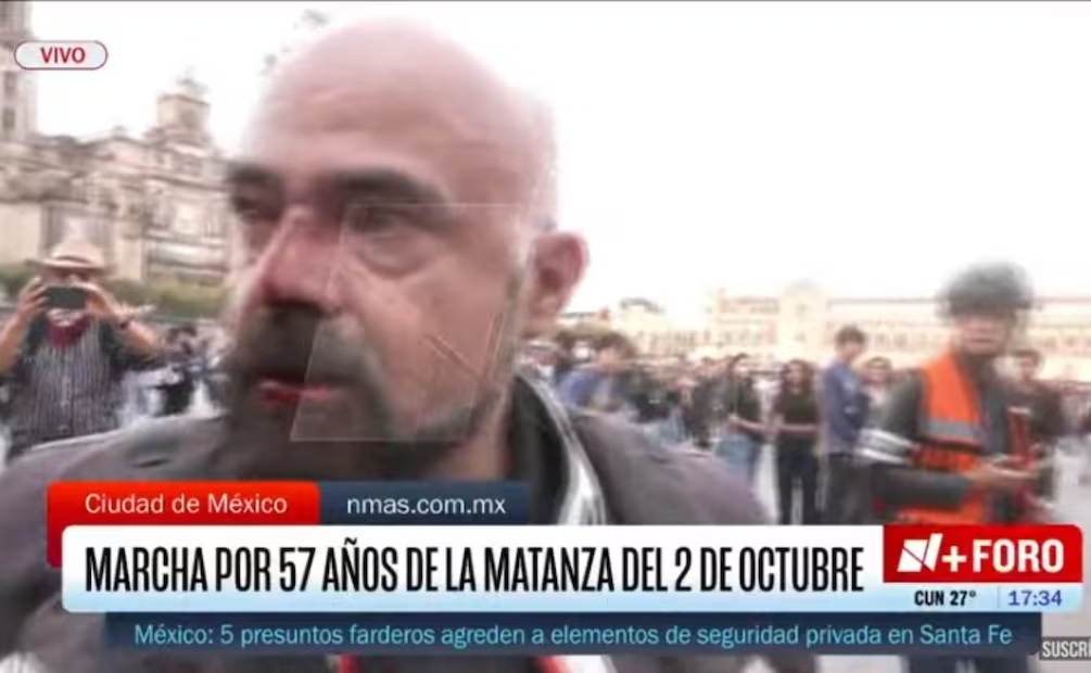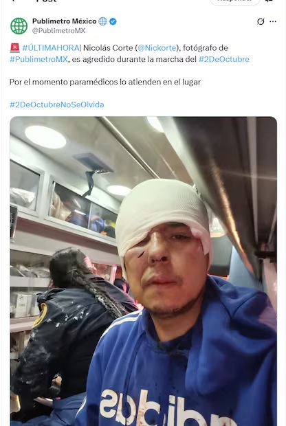 Nicolás Corte, identificado como fotógrafo de Publimetro MX, también fue reportado como agredido durante la manifestación de esta tarde en la capital del país con motivo de la mega marcha del 2 de octubre.
