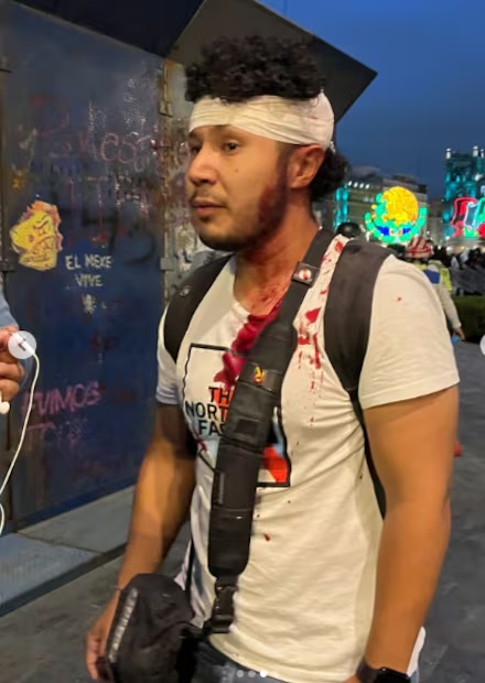 En una fotografía de Juan Abundis que compartió el medio en el que trabaja, se observa al joven con una playera blanca llena de manchas de sangre y la cabeza vendada, por lo que Obturador Mx dijo que se vulneró su integridad física y se violentó su labor periodística.