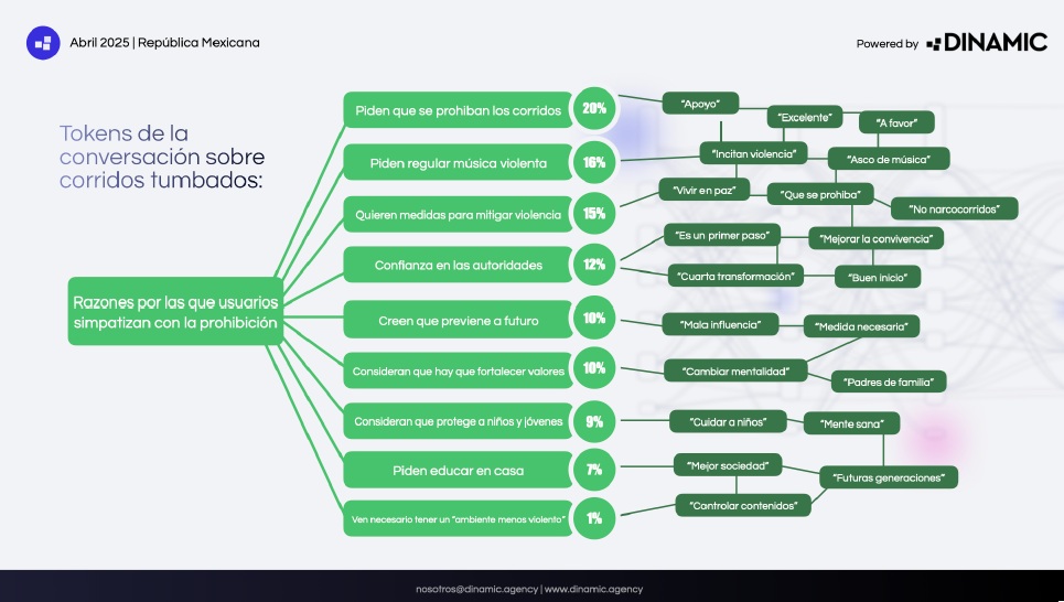 DINAMIC, empresa líder en escucha social expuso que entre quienes rechazan la prohibición los tres principales tokens (o frases de texto relacionados con el tema) son los siguientes: un 30% muestran rechazo a la autoridad con frases como “atiendan la violencia”, “combatan el problema”, ”mejor resuelvan la inseguridad”; un 20% hacen señalamientos de doble moral con frases como “ignoran el verdadero problema”, “estigmatizan” y otro 20% son cuestionamientos de hipocresía con frases como “en vez de combatir el narco”, “lo fácil es prohibir música”.