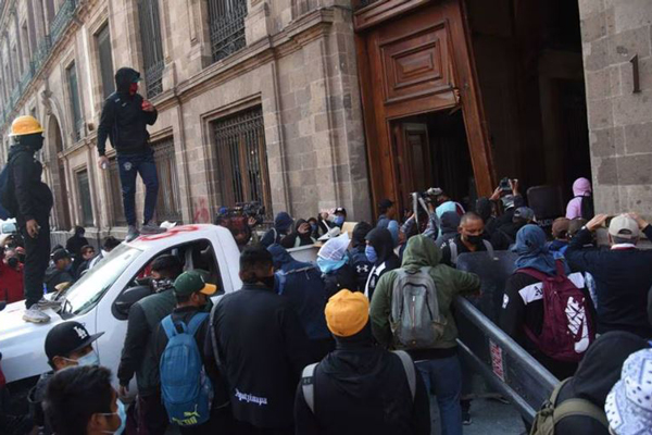 Un grupo de jóvenes con el rostro cubierto de Ayotzinapa irrumpieron y entraron a Palacio Nacional por el acceso de Moneda número 1.