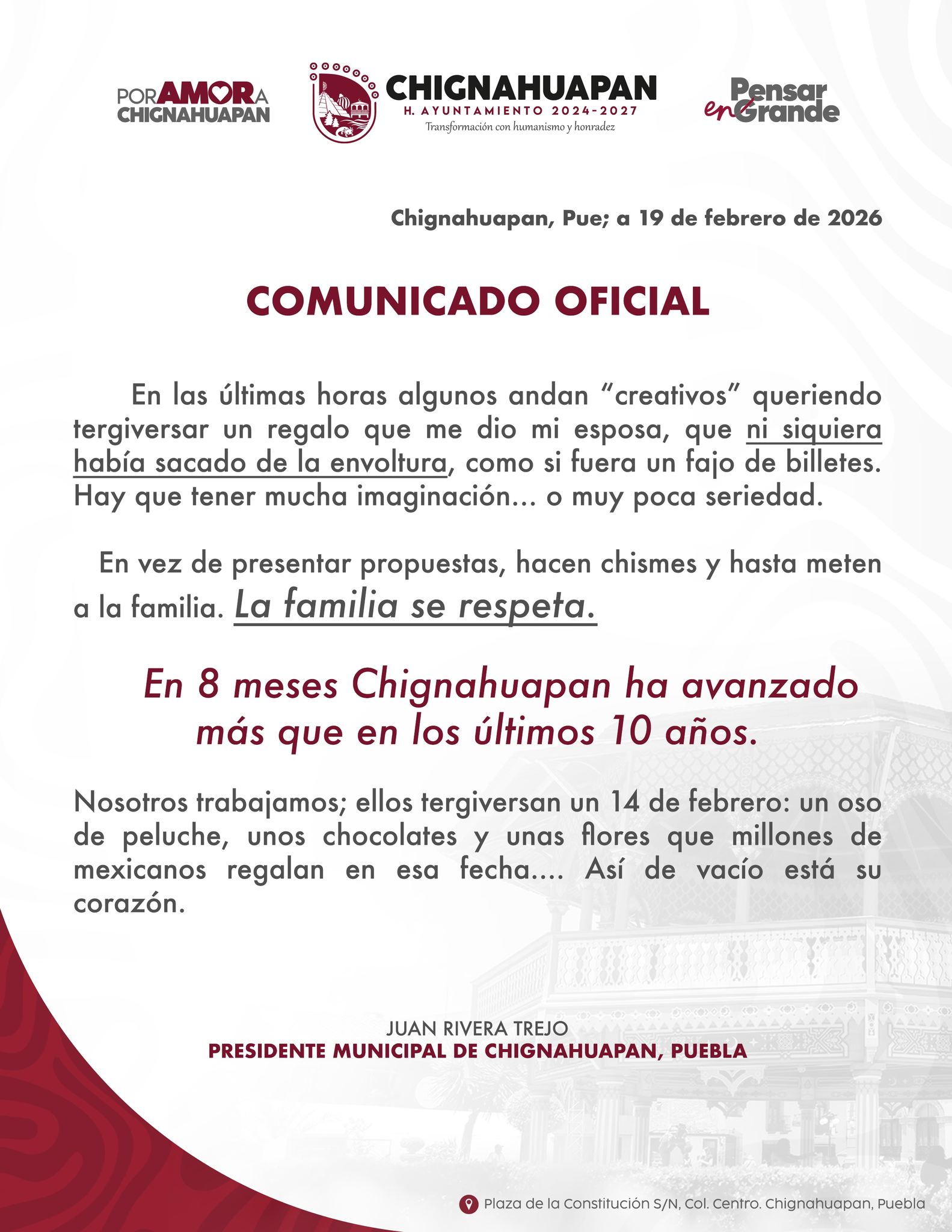 “En vez de presentar propuestas, hacen chismes, y meten a la familia. A la familia se le respeta (…) Nosotros trabajamos, ellos tergiversan un 14 de febrero: un oso de peluche, unos chocolates, y unas flores que millones de mexicanos regalan en esa fecha (…) Así de vacío está su corazón”, remata el comunicado.