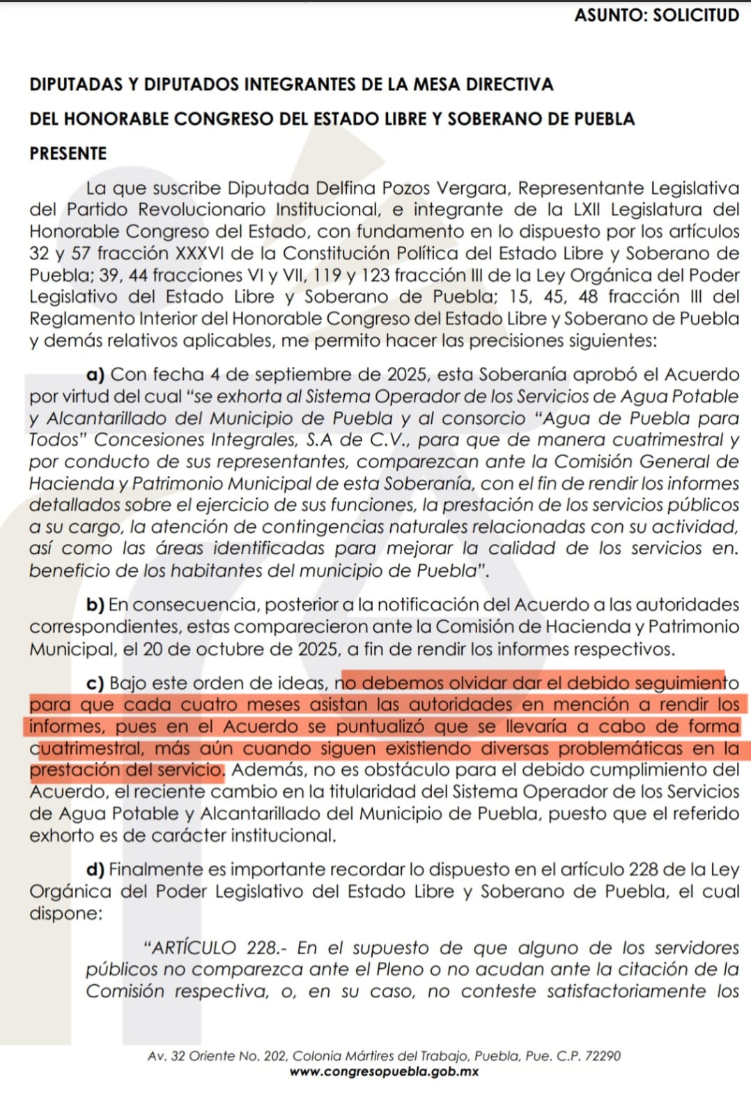 Mencionó el acuerdo del 4 de septiembre que el Congreso local aprobó para las comparecencias cuatrimestrales del Soapap y el consorcio Agua de Puebla ante la Comisión de Hacienda y Patrimonio Municipal.