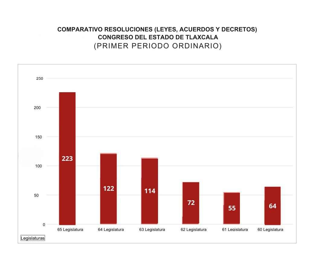Con 223 resoluciones, entre leyes, decretos y acuerdos esta Legislatura es considerablemente productiva, tan solo en el primer periodo que corresponde del 30 de agosto al 15 de diciembre del año en curso, es decir tres meses y 15 días, las y los diputados analizaron, discutieron y aprobaron en el Pleno temas importantes para el desarrollo y bienestar de los tlaxcaltecas.