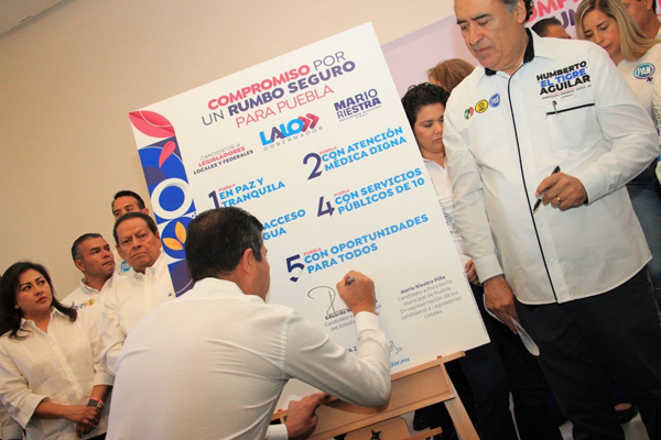 Lalo Rivera, candidato a la gubernatura del Estado y candidatos a legisladores locales y federales firmaron el ‘Compromiso por un Rumbo Seguro para Puebla’ para que los recursos de los programas federales regresen a la entidad y a los municipios y brindarles las herramientas para resolver las problemáticas que les aquejan.