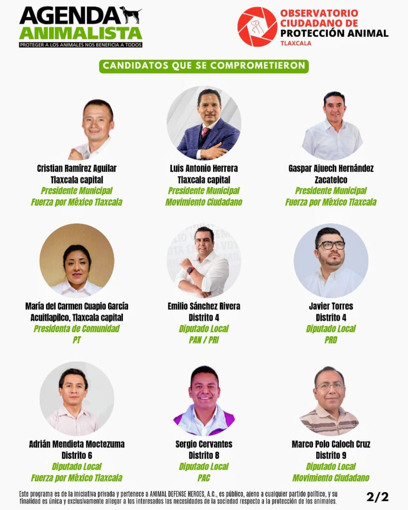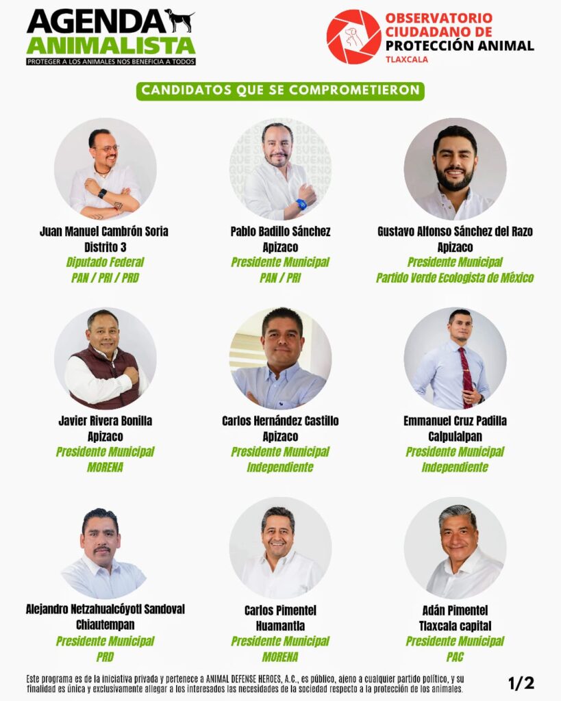 El Observatorio Ciudadano de Protección Animal (OCPA), en la recta final de la campaña electoral, realizó el corte hasta el 26 de mayo, de los candidatos que se comprometieron con la protección y el bienestar animal; los cuales firmaron la Agenda Animalista para Tlaxcala, generada por el OCPA y la ONG nacional Animal Defense Heroes A.C.