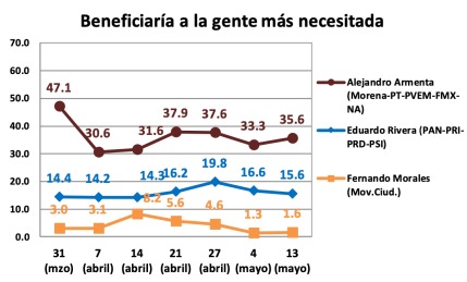 “Las respuestas han sido consistentes a lo largo de la campaña, colocando a Alejandro Armenta como el candidato que se preocupa por las personas más desfavorecidas con 36%, mientras que solo un 16% piensa que Rivera se preocupa por los más pobres”.
