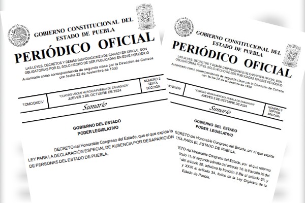 A 34 días de su aprobación en el Congreso de Puebla, la Ley para la Declaración Especial de Ausencia por Desaparición de Personas fue publicada en el Periódico Oficial del Estado (POE). Asimismo, la Ley de Amnistía enviada por el gobernador Sergio Salomón Céspedes Peregrina, que también entró en vigor recientemente, el pasado 3 de octubre.