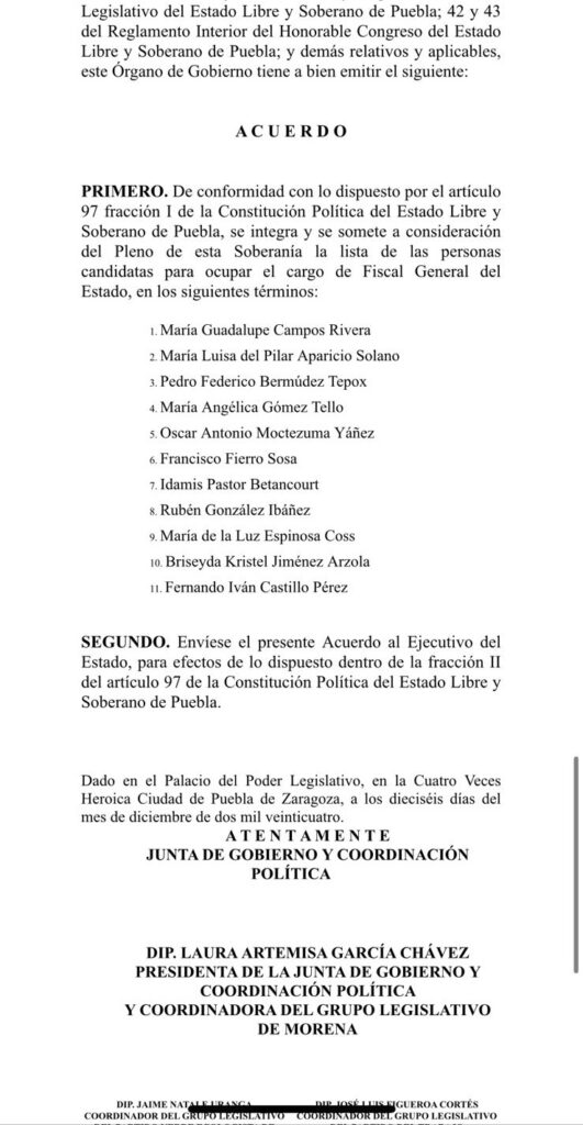 La Junta de Gobierno y Coordinación Política del Congreso de Puebla (Jugocopo) emitió el listado de aspirantes para ocupar la titularidad de la Fiscalía General del Estado (FGE).