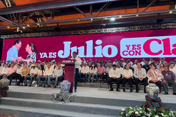 En las pantallas de la presentación se proyectó la frase “Ya es Julio y es con Claudia“. Actualmente Julio Huerta es el coordinador de la campaña de Sheinbaum en Puebla.