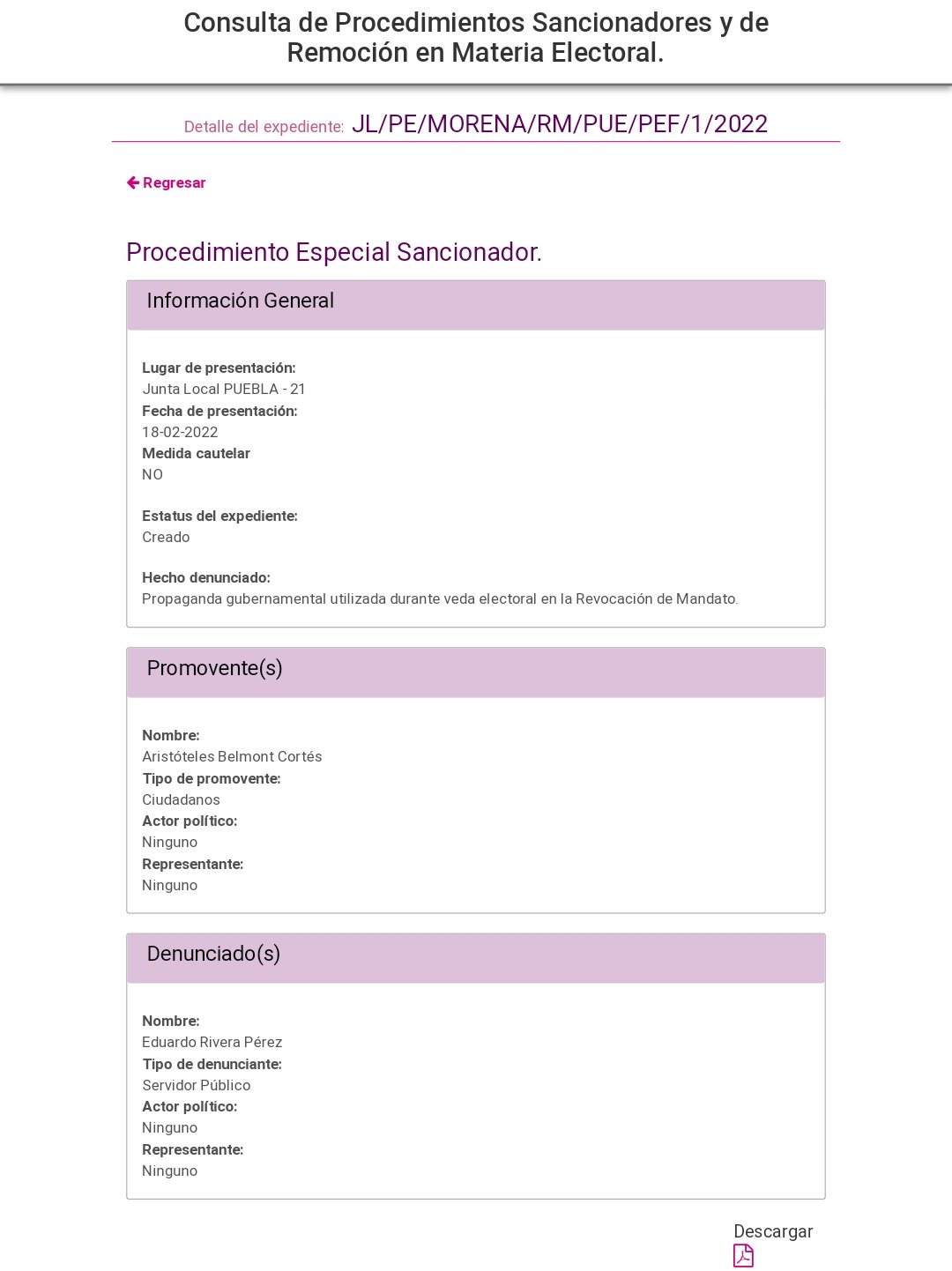 El expediente para un Procedimiento Especial Sancionador contra el alcalde capitalino del partido Acción Nacional (PAN) quedó radicado con el número JL/PE(Morena/RM/PUE/PEF/1/2022.
