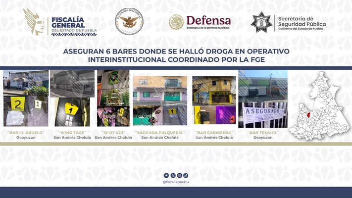 La Fiscalía General del Estado (FGE) de Puebla coordinó un operativo interinstitucional de seguridad en diferentes bares y chelerías de los municipios de San Andrés Cholula y Santa Clara Ocoyucan que dio como resultado el aseguramiento de seis estadounidenses dedicados a este giro donde fue hallada droga.
