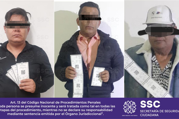 Los detenidos se identificaron como Miguel N., de 38 años y originario del estado de Puebla; Félix N., de 52 años y Julio N., de 46 años de edad, estos dos últimos de la Ciudad de México, quienes tenían en su posesión un total de 22 boletos, cuyo valor de venta se excedía al difundido por la empresa.