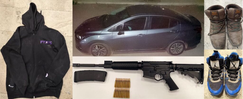 Con los ahora detenidos, se aseguraron un arma larga de fuego tipo AR15, 20 cartuchos útiles calibre .223 mm y un vehículo Nissan, Versa, color gris, utilizado por los probables responsables para huir del lugar de los hechos.