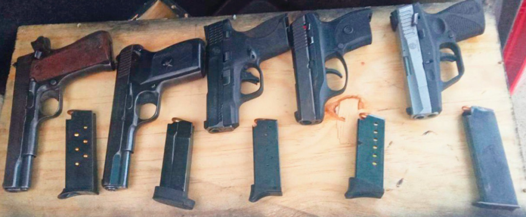 Durante la revisión preventiva, fueron detenidos José N., Mario N, Daniel N., y Jenifer N., sospechosos por robo camiones con mercancía que estaban en posesión de cinco armas de fuego tipo escuadra y cinco cartuchos útiles.