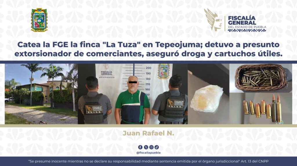 La Fiscalía General del Estado informa que como resultado de labores de inteligencia, análisis de la información y trabajo de campo, fue ejecutado un cateo en la finca “La Tuza”, del municipio de Tepeojuma, lo que derivó en la detención en flagrancia de Juan Rafael N., presunto responsable de delitos relacionados con la extorsión a comerciantes, asimismo, se aseguró droga y cartuchos útiles.