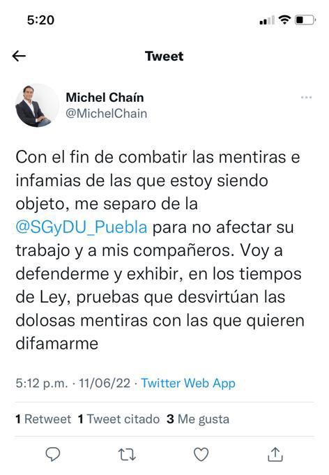 Chaín así lo expresó en su cuenta de Twitter luego de que el ayuntamiento de Puebla emitiera un comunicado donde reportó la renuncia de este por unas fotografías donde se observan lesiones causadas a Elia Rojas Villalpando, su ex pareja.