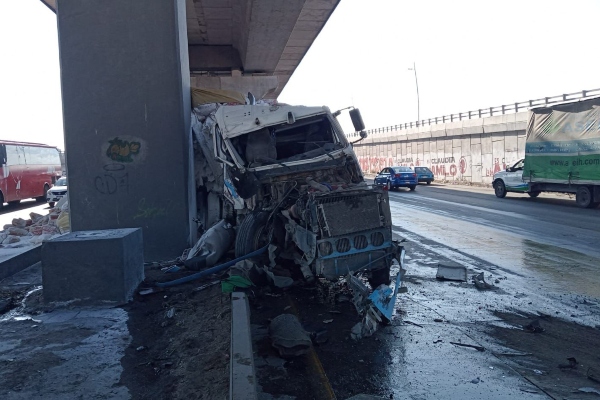 El conductor de un tractocamión que transportaba cemento se percató de la situación e intentó frenar, pero no pudo controlar la pesada unidad y terminó subiendo al camellón central del segundo piso de la autopista, estampándose contra las columnas.