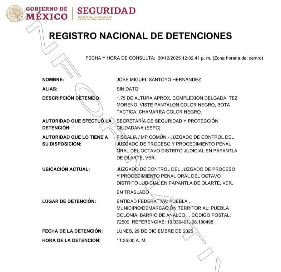 Mediante un comunicado, la Secretaría de Seguridad Pública (SSP) del Gobierno de Puebla confirmó la aprehensión del elemento policíaco, lo cual se conoció a través del Registro Nacional de Detenciones (RND) donde se especificó que la captura se realizó cuando se encontraba en las instalaciones de la Policía Estatal ubicadas en el barrio de Analco, de la capital poblana, el 29 de diciembre de 2025.