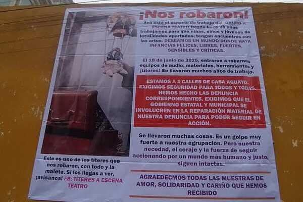 La agrupación artística “A Escena Teatro”, enfocada en el montaje de obras familiares, informó a representantes de la prensa que su espacio de trabajo fue saqueado el pasado 18 de junio, pero a seis días del suceso no hay avances respecto a los responsables ni tampoco en la investigación.