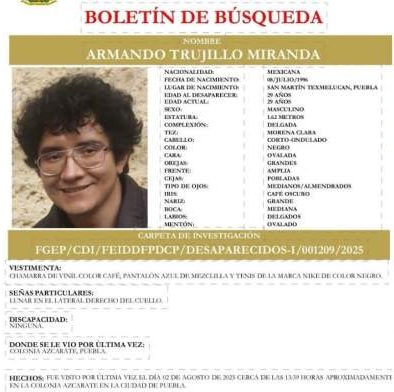 Familiares de Armando Trujillo Miranda fueron notificados la noche del sábado sobre la localización del cuerpo sin vida del joven de 29 años, reportado como desaparecido a inicios de agosto. Sus restos habían permanecido en el Servicio Médico Forense (Semefo) de la capital poblana desde el pasado 5 de agosto, sin que hasta ese momento se hubiera confirmado su identidad.