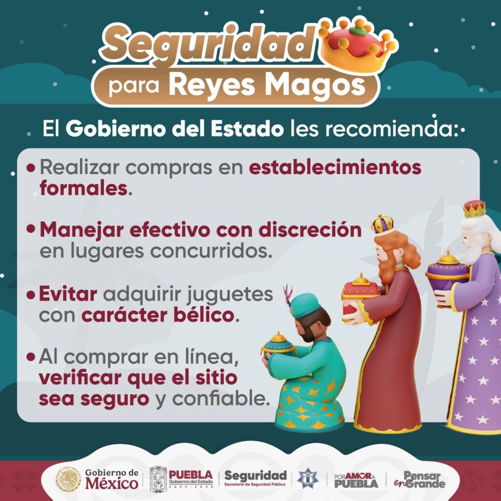 Para privilegiar la protección de las familias en torno al Día de Reyes, a través del Operativo Puebla Segura, la Secretaría de Seguridad Pública Estatal, Secretaría de Marina (SEMAR), Secretaría de la Defensa Nacional (DEFENSA), Guardia Nacional (GN), así como de distintas dependencias estatales y corporaciones municipales, mantienen el despliegue de más de 3 mil 500 elementos que realizan patrullajes de día y noche, tanto por aire con el uso de los helicópteros, como pie-tierra.