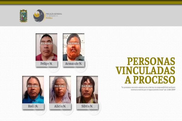 En audiencia, la Fiscalía de Puebla formuló imputación y presentó datos de prueba que permitieron obtener la vinculación a proceso de Felipe N., Armando N., Raúl N., Alicia N. y Silvia N. El Juez de Control les impuso la medida cautelar de prisión preventiva oficiosa.