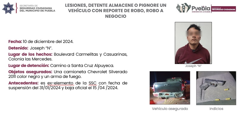 La Secretaría de Seguridad Ciudadana (SSC) de Puebla reportó la detención de Joseph N., un ex integrante de la Policía Municipal, por asaltar a mano armada una gasolinera y balear en el brazo a un despachador que intentó resistirse al atraco.