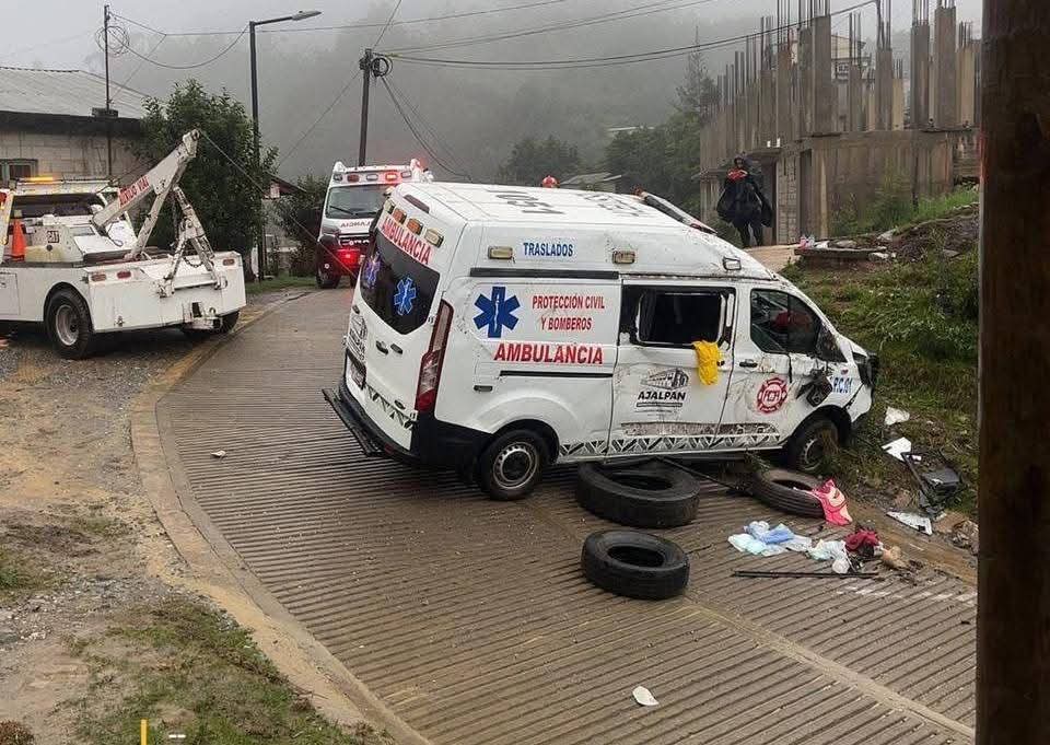 El accidente ocurrió cuando la unidad regresaba de una jornada de atención a los deslaves. El vehículo quedó volcado sobre una curva, dejando dos personas lesionadas, presuntamente parte del personal paramédico. Se trata de una de las ambulancias más antiguas del municipio.