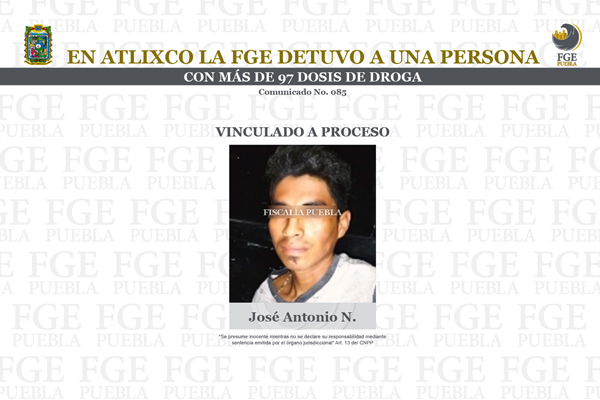 Por la presunta comercialización de narcóticos en el municipio de Atlixco, la Fiscalía General del Estado de Puebla llevó a cabo un cateo que derivó en detención de una persona en posesión de más de 90 dosis de metanfetamina.