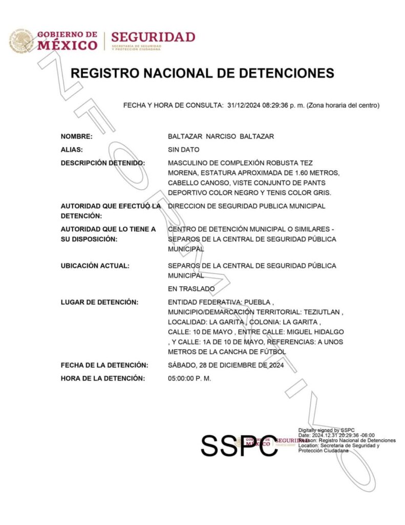 El Registro Nacional de Detenciones precisa que el exedil de Xiutetelco fue detenido el pasado 28 de diciembre de 2024 en la Localidad La Garita. Calle 10 de mayo entre calle Miguel Hidalgo y 1ª de 10 de Mayo, a unos metros de la cancha de fútbol.