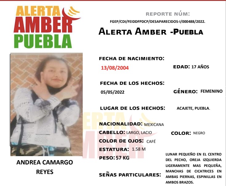 La primera alerta corresponde a la menor Andrea Camargo Reyes de 17 años que fue vista por última vez en Acajete el pasado 5 de mayo.