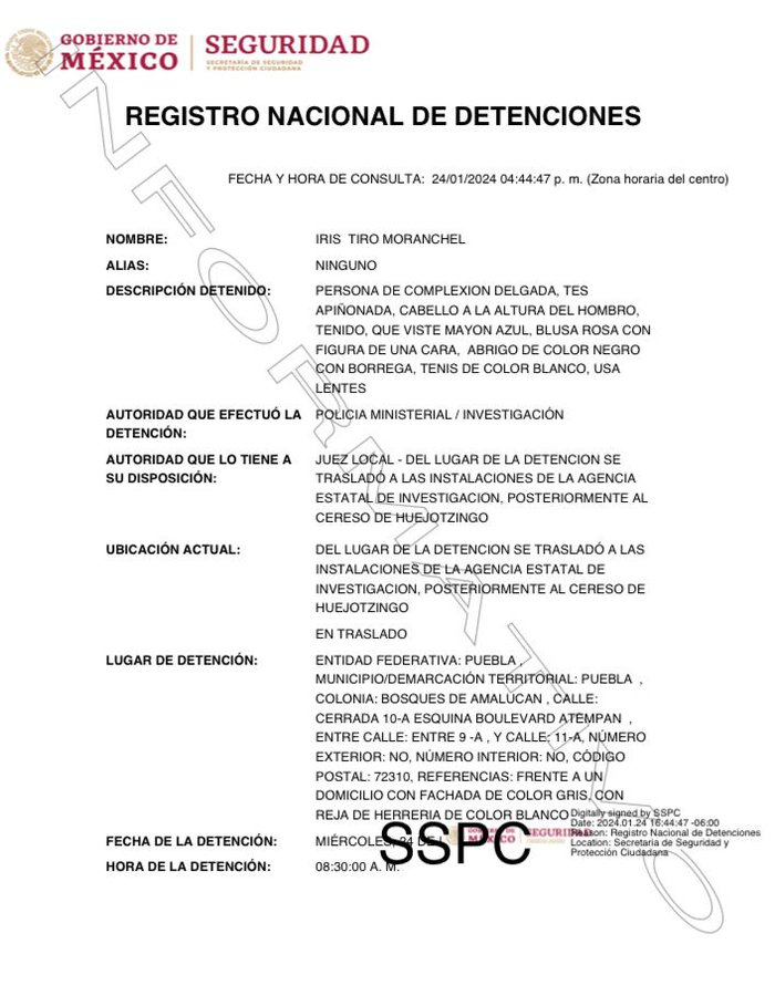 A través del Registro Nacional de Detenciones (RND), se informó que la detención se hizo por agentes ministeriales de la Fiscalía General del Estado (FGE), a las 9 de la mañana de este miércoles en la esquina de la calle Cerrada 10 A y Bulevar Atempan entre la 9 y 11 A.