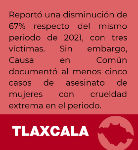 Entre los nueve delitos de alto impacto analizados, Causa en Común detectó posibles anomalías en el feminicidio debido a que Tlaxcala reportó una disminución de 67% respecto a 2021, además de que los registros oficiales no concuerdan con los reportes en medios de comunicación que durante el año pasado cubrieron asesinatos de mujeres con extrema violencia.