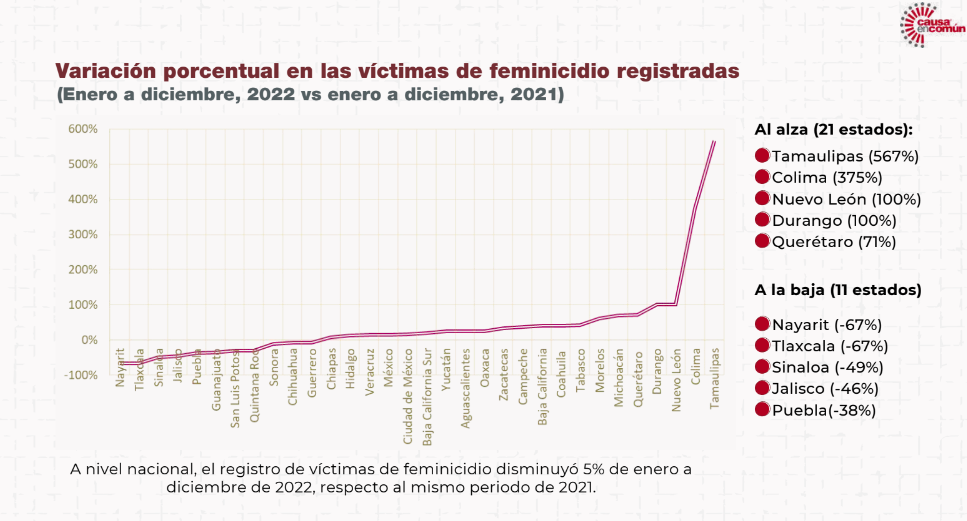En materia de feminicidios la cifra oficial de tres casos investigados choca con los cinco registros de mujeres asesinadas con extrema violencia que Causa en Común documentó, además del aumento en el número de asesinato de mujeres clasificados e investigados como homicidio doloso.