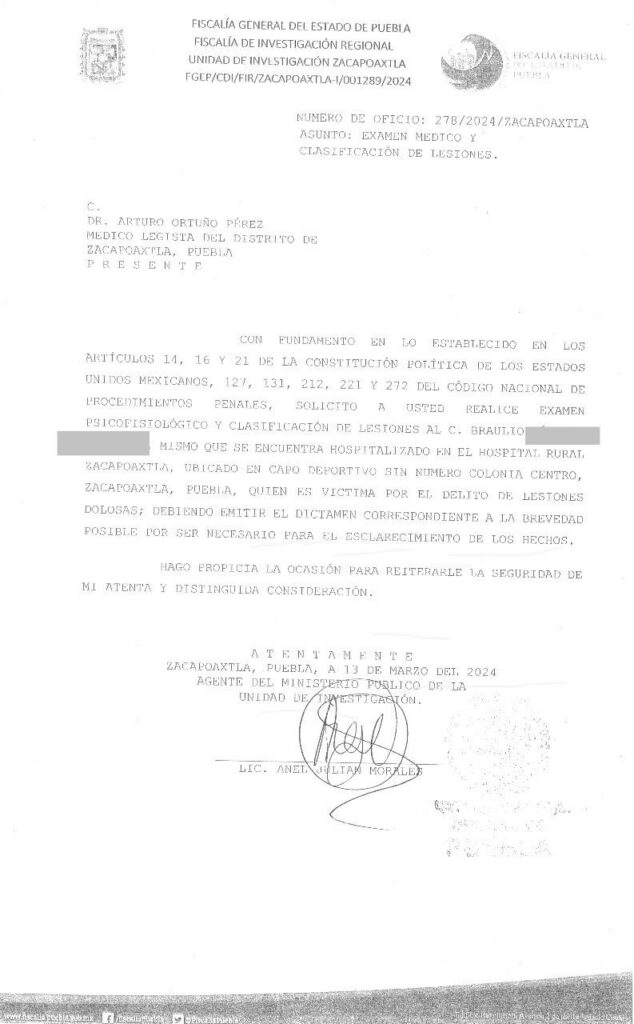 Tras el reporte. se inició la carpeta de investigación FGEP/CDI/FIR/ZACAPOAXTLA-/001289/2024 por el delito de lesiones dolorosas.