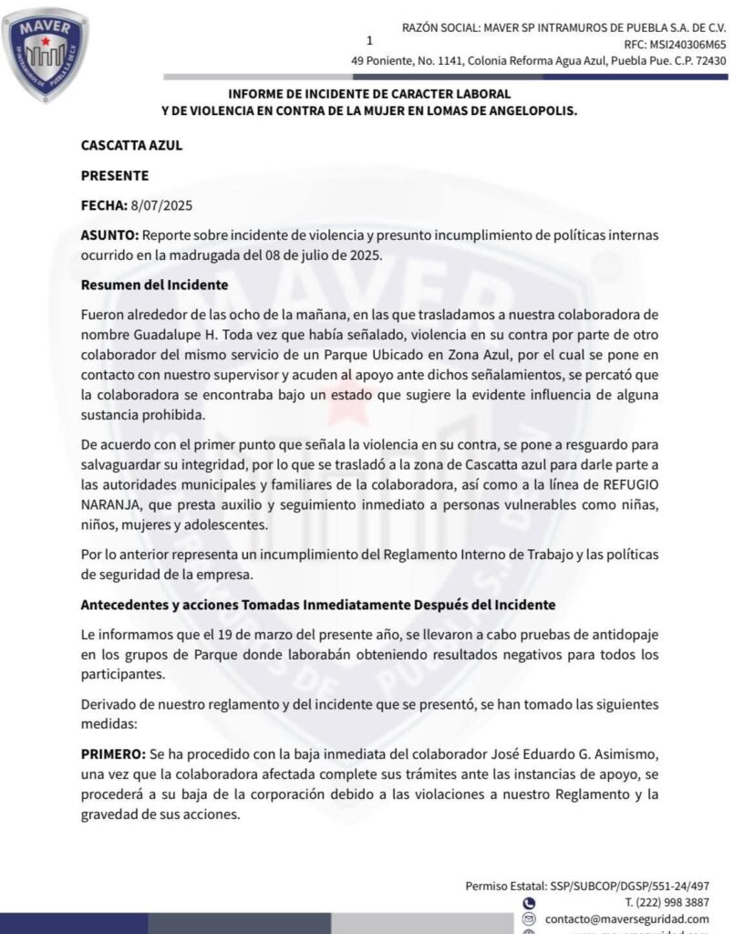 La petición de auxilio generó la movilización de sus compañeros, así como la intervención de la línea Refugio Naranja, por lo que la guardia de seguridad de Angelópolis fue trasladada a las instalaciones de Cascatta Azul, lugar en el que fue atendida y se dio parte a las autoridades así como a sus familiares.