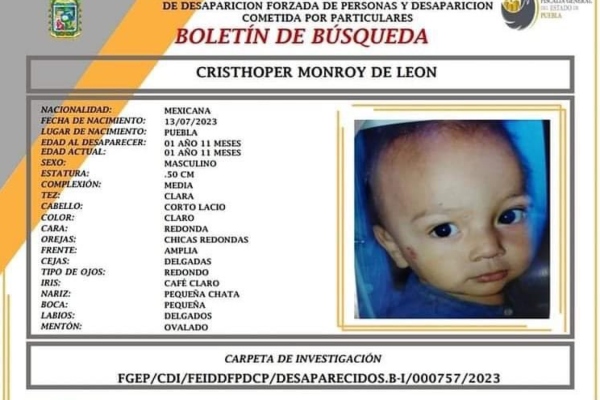 Cristopher Monroy de León, de 1 año 11 meses de edad y desaparecido en el municipio de Atlixco, pudo caer a un canal de agua el 3 de junio por la fuerte lluvia, pues según videograbaciones “nunca salió de su casa”.