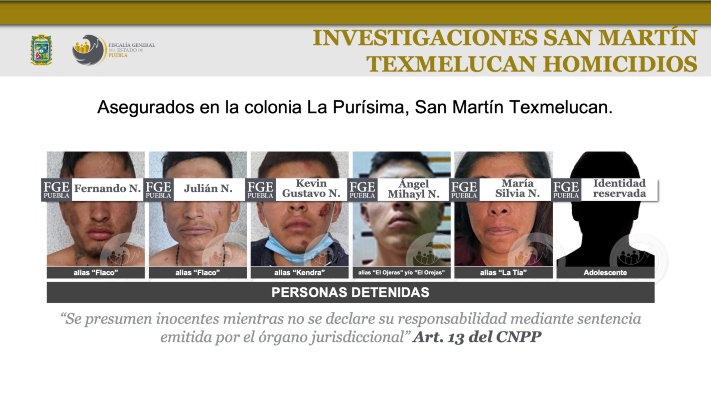 Los detenidos se aseguraron en la colonia La Purísima y en el centro del municipio de San Martín Texmelucan. Se trata de Fernando N, Julián N, Kevin Gustavo N, Ángel Mihayl N, María Silvia N, Ángel N, Javier N, Luis Gerardo N, y uno más del que se resguardó su identidad.